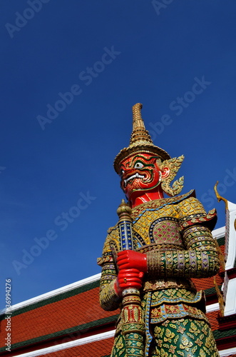 giant, statue, sculpture, art, colourful, red, delicate, detail, beauty, temple, buddhist, buddhism, guard, guardian, soldier, protect, fear, anger, evil, devil, bad, siam, thai, bangkok, fang