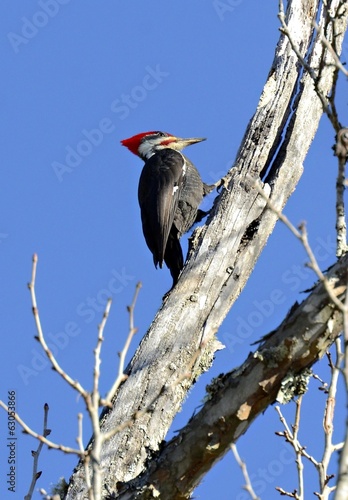 bird, animal, tree, red, head, woodpecker, blue, sky, wild, nature, outdoors, 1, pecking, winter