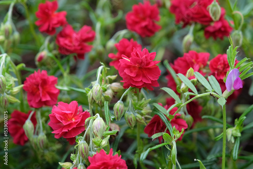Red Helianthemum, common rock rose ‘Cerise Queen’ in flower.