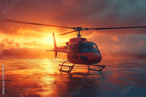 helicopter, red, sunset, city, skyline, orange, cloud, sky, aircraft, rotor, blade, urban, dusk, evening, twilight, transportation, flight, aerial, view, landscape, scene, horizon, building, city landscape, light, shadow, ground, helipad, machine, aviation, travel, journey, adventure, power, speed, technology, modern, majestic, impressive, vibrant, colours, sunrise, gold, hours