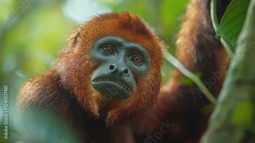 monkey, red, rainforest, portrait, treetop, primate, jungle, wildlife, amazon, animal, mammal, nature, wild, forest, leaf, tree, green, closeup, face, eye, fur, branch, habitat, fauna, tropical, conservation, endangered, species, biology, zoology, ecology, background