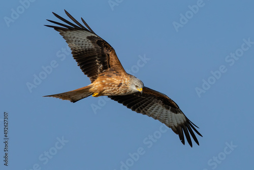 Red kite, milvus milvus, flying on clear sky with spread wings in summer. Bird of prey in the air on blue background. Feathered predator moving in wilderness.