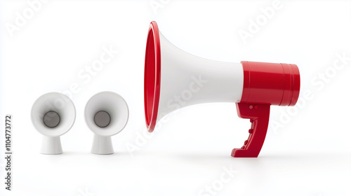 Red Megaphone and Small Speakers: A striking image of a red and white megaphone accompanied by two smaller white speakers, ideal for conveying concepts of communication, announcements.