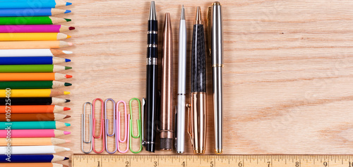 crayons, pen, paper clip, ruler, write, education, stationery, desktop, desk, study, communicate, tool, tip, sharp, student, supply, draw, business, school, equipment, colourful, oak, organise, clean, college, object, learn, traditional, back, class, nobody, overhead, topview