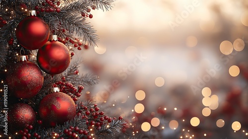 Red ornaments on the left side of a frame with blurred lights in the background, leaving room for a festive message in the center