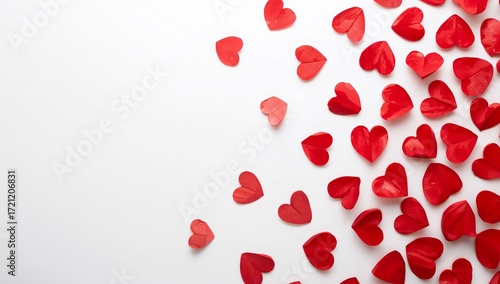 Red paper hearts, romantic, scattered on a white background with copy space.