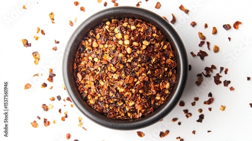 spice, flake, pepper, red, bowl, food, ingredient, culinary, seasoning, hot, chili, crushed, dry, cooking, aromatic, favor, cookery, tasty, paprika, vibrant, closeup, overhead, view, nobody, white, background, texture, grain, dark, container, natural, organic, simple, fresh, pungent, sharp, fiery, spicey, delicious, aroma, kitchen, healthy, raw, meal, preparation, eat, dish, small, scattered