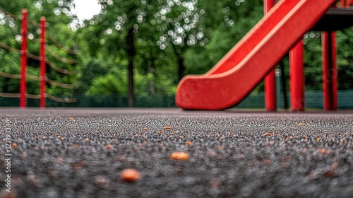 playground, red, slide, park, safety, surface, children, fun, play, equipment, summer, children, children, game, activity, recreation, leisure, toddler, infant, preschool, school, ground, playground equipment, colourful, bright, happy, joyful, healthy, active, rubber, granule, texture, closeup, surface level, low angle, sharpened, detail, speckle