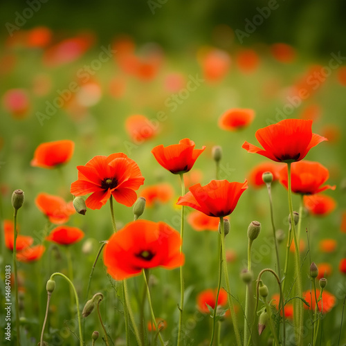 red poppies on background of green field