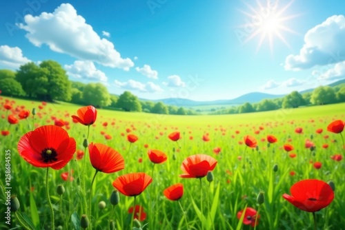 Red poppies scattered across a lush green meadow under a bright summer sky , poppy, landscape