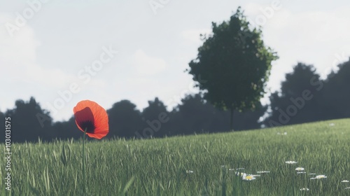 Red Poppy Flower in Green Meadow with Tree and Daisies