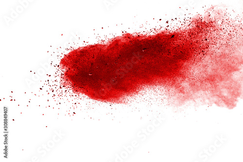 Red powder explosion on white background. Colored cloud. Colorful dust explode. Paint Holi.
