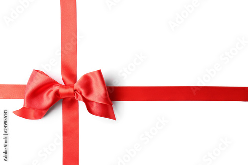 Red ribbon with bow on white background. Festive decoration