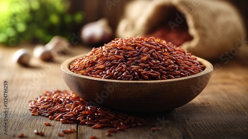 Red rice in wooden bowl on rustic table with burlap bag in background