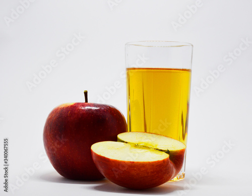 red, ripe apples and a glass of apple juice on a white background. apples are a source of vitamins and iron during quarantine and self-isolation