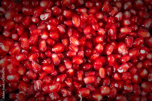 red ripe pomegranate seeds closeup. health food. beautiful background texture of pomegranate fruit seeds
