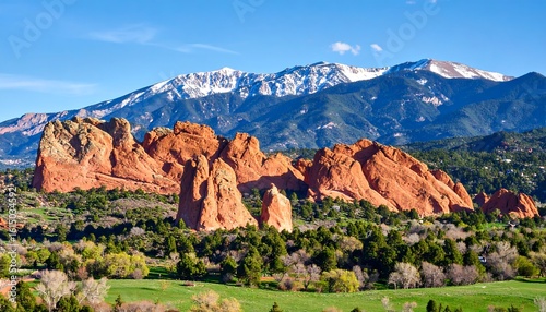 mountain, rock, red, snow, landscape, scenic, colorado, spring, nature, outdoors, peak, vale, view, sunlight, blue, sky, green, tree, grass, colours, huge, majestic, rocky, flora, fauna, panorama, elevated, viewpoint, natural, beauty