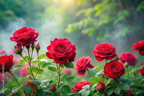 red roses in bloom against misty green background with depth of field