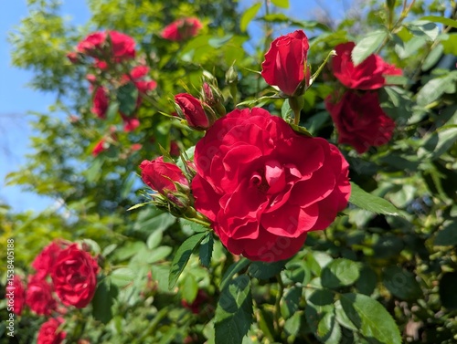 Red roses on a bush on a sunny day. The sun emphasizes the velvety texture of the petals and creates a warm, summer atmosphere. In the background - a blue sky and blurred silhouettes of other flowers