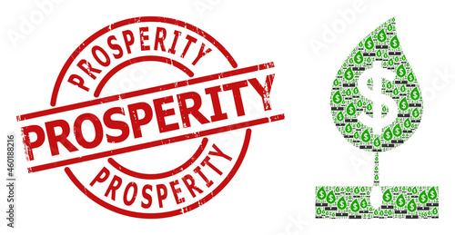 Red round stamp seal has Prosperity text inside circle. Vector dollar sprout fractal is made with repeating recursive dollar sprout parts. Scratched Prosperity stamp,