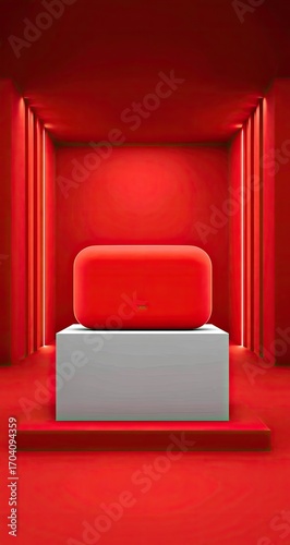 speaker, red, white, pedestal, room, digital, product, display, technology, audio, modern, minimalist, design, contemporary, tech, futuristic, rendering, three-dimensional, image, presentation, showcase, spotlight, illumination, geometric, clean, simple, elevated, still life, object, light, line, vertical, horizontal, box, cube, geometry, studio, promotion, techy, white background, bright, focused, technically