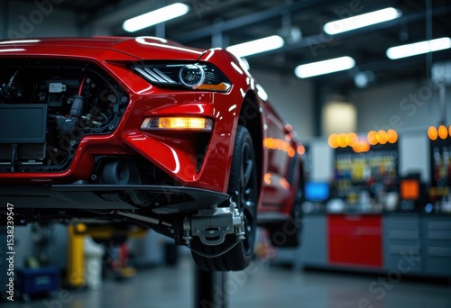 car, vehicle, automobile, red, sport, workshop, garage, maintenance, repair, lift, engine, tire, wheel, tool, equipment, mechanic, industry, transportation, automotive, service, technology, modern, indoor, machinery, part, assembly, auto, speed, performance, copy space, space