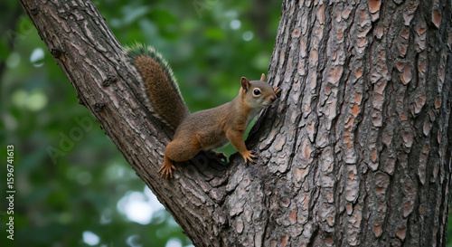 Red squirrel climbing on pine tree bark in forest. Small rodent with bushy tail on textured trunk. Urban park and woodland wildlife content