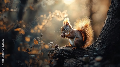 squirrel, red, autumn, forest, sunlight, eating, nut, tree, tree branch, timberland, nature, wild, animal, mammal, rodent, bushy, tail, paw, claw, fur, brown, orange, light, shadow, bokeh, background, scene, image, photo, wildlife, adorable, cute, charming, small, tiny, majestic, elegant, beautiful, vibrant, colourful, gold, dark, mystical