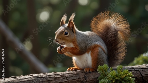 squirrel, red, tree, tree branch, eating, nut, fur, tail, bushy, rodent, mammal, wildlife, nature, animal, wild, forest, wood, timberland, outdoors, park, garden, cute, fluffy, adorable, small, tiny, brown, grey, white, orange, spring, summer, autumn, season, sunlight, sunshine, day, light, closeup, macro, portrait, sharpened, sharp, detail, image, photo, picture, background, bokeh