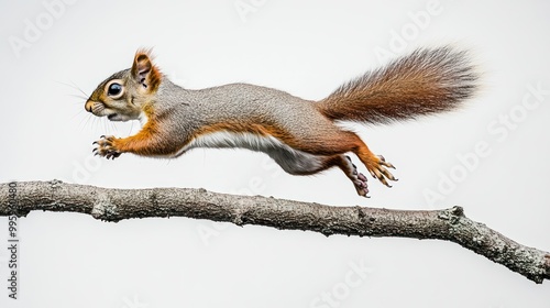 squirrel, red, leaping, jumping, tree branch, tree, tail, bushy, fur, fluffy, white, background, nature, wildlife, animal, mammal, rodent, cute, adorable, paw, claw, grey, brown, colours, motion, blur, sharpened, outdoors, forest, park, wild, eye, nose, whisker, sharp, sprayed, agility, energy, active, playful, photo, photo, image