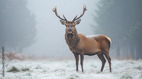 Red stag in the misty countryside. natural forest, natural and mystical aura.