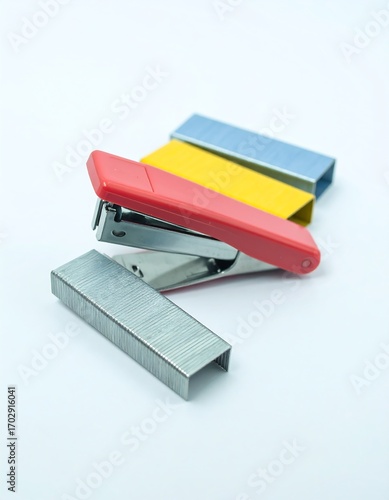 stapler, staple, red, yellow, blue, office, stationery, supply, metal, paper, document, clip, colourful, tool, business, workplace, school, equipment, accessory, organised, work