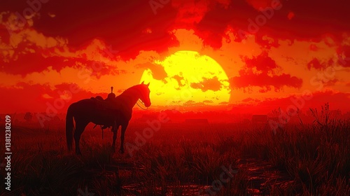 Red Sunset, Lone Horse: A Fiery Western Scene