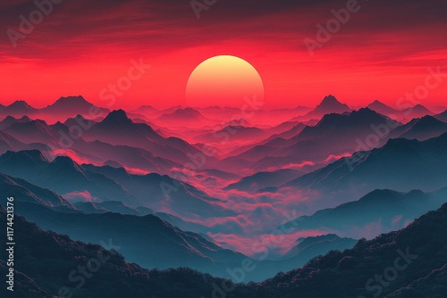 sunset, mountain, range, cloud, vale, red, sky, sun, landscape, nature, scenery, view, horizon, peak, hill, fog, mist, dawn, dusk, atmosphere, scenic, panorama, beauty, majestic, dramatic, vibrant, colourful, awesome, amazing, incredible