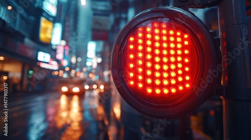 traffic, light, red, urban, street, night, car, rain, neon, signs, city, stop, indicator, light, transport, safety, movement, road, vehicle, wet, surface, glow, dusk, environment, electric, pattern, design, modern, technology