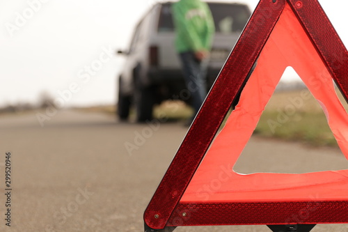 Red triangle of a stopped car on the road. An emergency stop sign mounted on the road against the background of stopped car. The concept of safe traffic on the road.