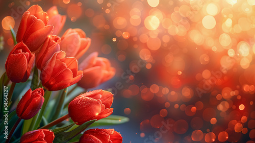 red, tulip, bouquet, bokeh, background, blurred, light, greeting, card, postcard, design, beautiful, spring, flower, rain, drop, nature, concept, flora, garden, beauty, blossom, floral, bloom, colours, flower petals, bright, colours, ai, generated, copy, space, magical, atmosphere, day, celebration, international, woman, february, march, love, summer
