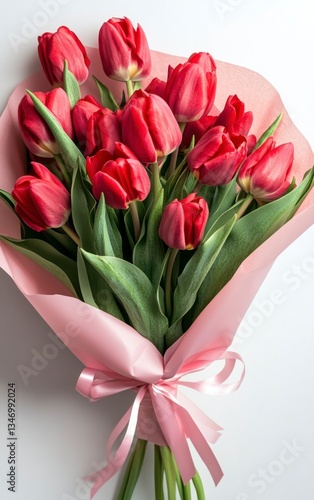 tulip, bouquet, wrapping, tying, floral, arrangement, present, giving, celebrate, cut-out, bloom, blossom, flower, stem, leaf, wrapping paper, pink, red, ribbon, satin, bow, indoor, gift, romantic, festive, freshness, decoration, white background, studio shot, still life, flora, closeup, holiday, spring, celebration, event, surprise, february 14, mother's day, love