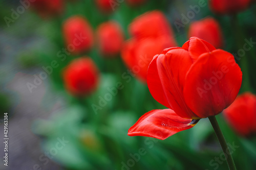 Red tulips in the spring sunlight, dew drops on red petals. Close Up of red tulip. Soft, selective focus.