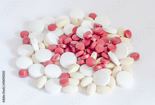 Red, white and yellow drugs pills, powder, bunch, medical, homeopathic, white background, close up