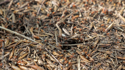 Red wood ants moving on the nest. Anthill with red wood ants in spring close up