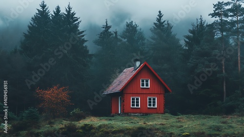 Red Wooden House Surrounded By Dense Forest And Misty Environment
