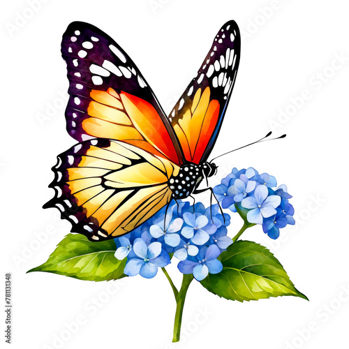Reddish orange Butterfly witting on hydrangea watercolor illustration, blue flower, insect, decorative element for scrapbooks, beautiful scene