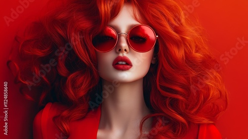 Red-Haired Woman in Red Outfit and Sunglasses Against Bright Red Background Creating Bold and Stylish Scene