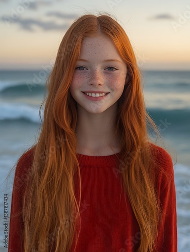 girl, redhead, portrait, beach, sunset, ocean, wave, smiling, happy, outdoors, beauty, children, children, teenage, family, summer, vacation, travel, photo, model, fashion, style, portraiture, cute, pretty, beautiful, cheerful, caucasian, long hair, warm, light, colours, gold, horizon, nature, scenic, image, photo, people, childhood