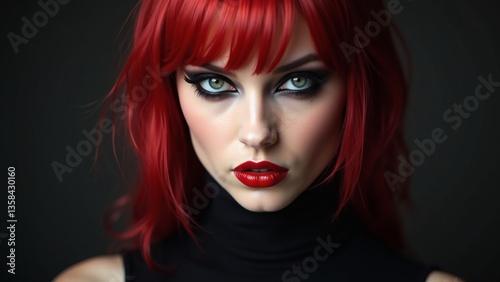 portrait, striking, woman, vibrant, red, hair, redhead, dark, smoky, make-up, bold, red lips, black, turtleneck, intense, gaze, dramatic, lighting, gothic, edgy, fashion, beauty, model, eye, glamour, studio, coiffure, sensuality, closeup, elegance