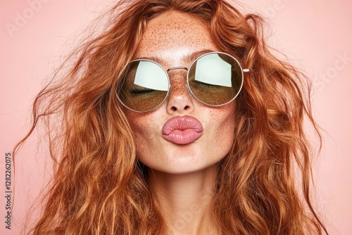 woman, model, redhead, sunglasses, fashion, beauty, freckle, lip, pucker, kiss, pink, background, studio, portrait, style, trendy, stylish, glamour, make-up, cosmetic, coiffure, hair, curly, long hair, cute, young, female, face, expression, playful, seductive, sensual, romantic, love, valentine, flirt, fun, happy, cheerful, positive, emotion, summer, spring, eyewear, accessory, girl, people, person, caucasian