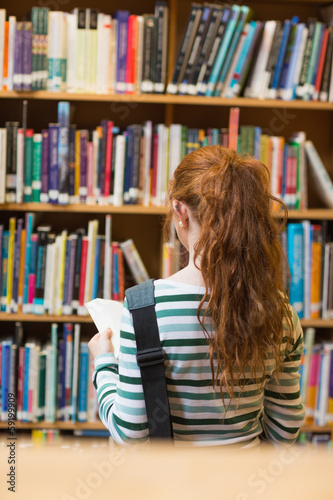 young adult, woman, female, caucasian, indoor, academic, book, bookshelf, bookshelf, college, education, cognition, library, literature, research, shelf, student, university, casual attire, study, educational, textbook, smart, bookcase, information, standing, shoulder bag, book bag, holding, reading, pretty, attractive, redhead, red hair, ponytail
