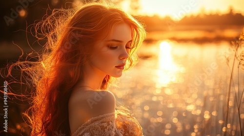 Redheaded woman in a dress, bathed in the golden light of sunset by a tranquil lake, captured in an intimate, close-up portrait.