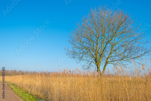 tree, reed, plant, winter, nature, scenic, sky, blue, outdoors, landscape, rural, sunlight, sunny, perspective, horizon, tranquil, holland